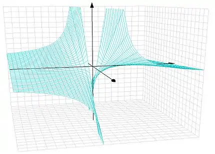 На множестве пар вещественных чисел область значений функции деления графически имеет вид гиперболического параболоида — поверхности второго порядка[5].