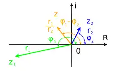 Деление комплексного числа в показательной форме, на комплексное число сводится к повороту вектора, соответствующего числу , на угол и изменению его длины на раз. Для частного комплексных чисел в показательной форме верно равенство: