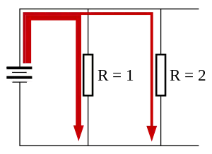 Простейший резистивный делитель тока — это два параллельно включённых резистора и , подключённых к источнику напряжения . Поскольку резисторы соединены параллельно, то к ним приложено одинаковое напряжение.