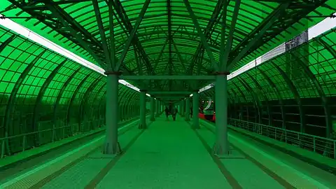 Остановочный пункт расположен на 658-метровой эстакаде. Имеет одну островную платформу, прозрачные навесы зелёного цвета сверху и по бокам, защищающие пассажиров от ветра и дождя.