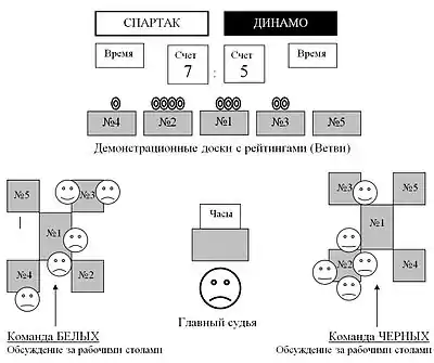 Каждой из команд для свободного обсуждения позиций и расчёта вариантов предоставляется по 5 обычных шахматных досок (см. Схему № 1). За каждой такой доской команда (или её часть) обсуждает позицию одной из ветвей партии (см. Рис. № 3 и видеофрагменты обсуждений в команде «Белых» и в команде «Черных»). Формы организации дискуссии и процесса принятия решений определяются командами самостоятельно. Интерактивный когнитивный сценарий лишь предполагает возможность альтернативных действий каждого члена команды (с помощью Ветвления) в сочетании с возможностью последующего отказа от них, когда команде становится очевидной их ошибочность (с помощью Отбора).