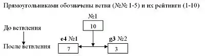 - Ветвление — удвоение позиции одной из имеющихся ветвей — материнской — и распределение её рейтинга между двумя дочерними ветвями. Дальнейшие перемещения фигур в дочерних ветвях различны.
