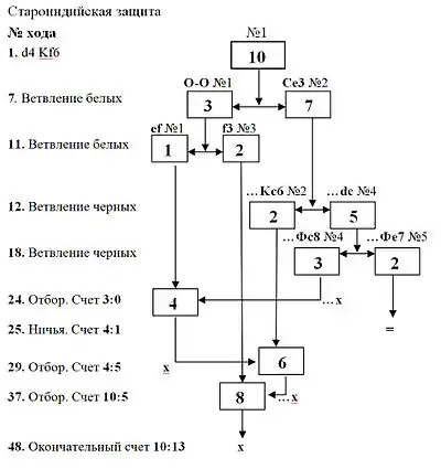 На Схеме № 4 показано увеличение числа ветвей (после 7 хода — две ветви, после 11 хода — три ветви, после 12 хода — четыре ветви, после 18 хода — пять ветвей). Затем в результате отборов и ничьей (соответственно на 24, 25, 29 и 37 ходе) число ветвей постепенно уменьшается. После 37 хода до конца игры остаётся только одна ветвь с рейтингом 8.