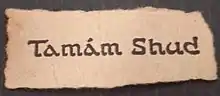 Во время одного из осмотров тела погибшего в секретном кармане его брюк был найден свёрнутый клочок бумаги[39], содержащий странную надпись «Tamam Shud» (Тамам Шуд). В дальнейшем при публикации материала на эту тему в одной из газет была допущена опечатка: вместо «Tamam» было напечатано слово «Taman», в результате чего в историю вошло именно ошибочное название[40].