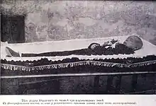 Труп был в сидячем положении, со связанными руками, в одном белье и единственном чулке. Рядом находились его куртка, кушак, фуражка и тетради, сложенные в трубочку и засунутые в углубление в стене. В кармане тужурки оказался кусок наволочки со следами спермы; впоследствии выяснилось, что этой наволочкой во время убийства мальчику заткнули рот[19][18].
