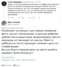 | ТВЦ | «убийственный пост», который «призывал расправляться с детьми сотрудников правоохранительных органов» или «призывал убивать детей сотрудников полиции»[19] |