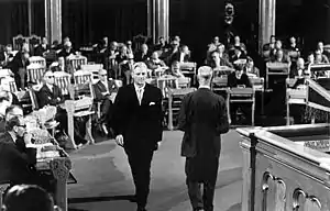 Левые социалисты оказались на перепутье, однако они решили примкнуть к оппозиционной коалиции и проголосовали «за». Свой поступок социалисты мотивировали тем, что они потеряли уважение к Премьер-министру, а не к самой НРП, которая его привела. Именно тогда была сделана фотография, опубликованная в газете «Aftenposten» и ставшая одним из символов норвежской политики. На фотографии запечатлены Эйнар Герхардсен, покидающий трибуну Стортинга, и Йон Линг, направляющийся к ней.