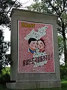 Плакат северокорейской пропаганды, гласящий: "Давайте перейдем к единой стране к следующему поколению!".