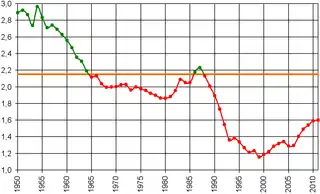 Рождаемость в СССР, в частности среди Европейских народов и республик, сначала упала ещё в 1967 ниже уровня воспроизводства населения (2,1 рождения на одну женщину), а с 1992 года в России — ниже уровня смертности.