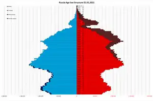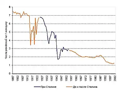 С 1925 по 2000 год суммарный коэффициент рождаемости в России снизился с 6,80 до 1,21 ребёнка на одну женщину, из них 71 % общего снижения приходятся на 1925—1955 годы[19]. Несмотря на этот спад и потери в результате войны, население РСФСР за 1925—1955 годы выросло на 25 млн. Резкий спад коэффициента рождаемости произошёл в начале 1990-х[20]; в это же время смертность в России стала устойчиво превышать рождаемость. На 2021 год в России насчитывалось чуть более 7,5 млн женщин в возрасте от 20 до 29 лет (около 5,1 % населения России). С 2010 года количество женщин в данном возрастном диапазоне сократилось на 37,5 %.[21] С 1990 по 2019 годы суммарный коэффициент рождаемости (СКР) в России снизился с 1,892 до 1,504 рождений на женщину, а мировой СКР за указанный период времени снизился с 3,249 до 2,403 рождений на женщину.[22][23][24]