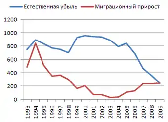 Начиная с 2001 года, естественная убыль населения почти постоянно сокращалась (с 958,5 тыс. в 2000 году до 248,9 тыс. в 2009 году)[34]. С 2004 года начался устойчивый рост миграционного притока в Россию, достигшего в 2009 году 247 тыс. мигрантов, получивших российское гражданство[37].