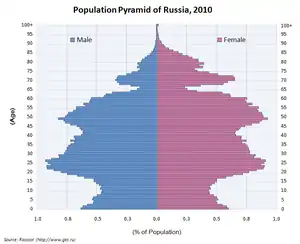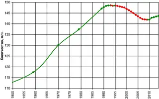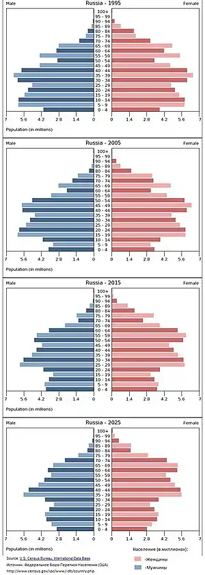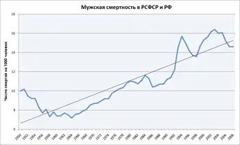 В 1990-х годах смертность в 1,5 раза превышала рождаемость. К концу 1990-х годов темпы естественной убыли населения превысили 900 тыс.[34]. По данным переписи населения 2002 года численность населения России с 1989 по 2002 год сократилась на 1,8 млн (~на 1,3 %)[35]. Особенно велика была смертность среди российских мужчин, средняя продолжительность жизни которых равнялась 61,4 года[36]. Средняя продолжительность жизни женщин за тот же период составила 73,9 года[36].