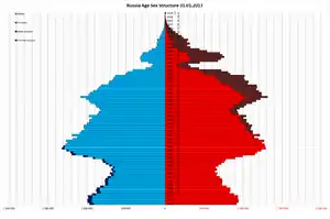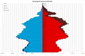 За первое полугодие 2015 года в России родилось 926,8 тыс., а умерло 988,1 тыс. В июне 2015 года впервые с начала года был естественный прирост в 4,5 тыс.[48]. В январе—июне 2015 года естественная убыль удвоилась, а миграционный прирост сократился по сравнению с тем же периодом 2014 года[49]. По состоянию на 2015 год число подростков сократилось за последние 15 лет на 40 %[50]. На 2021 год в России насчитывалось чуть более 7,5 млн женщин в возрасте от 20 до 29 лет (около 5,1 % населения России). С 2010 года количество женщин в данном возрастном диапазоне сократилось на 37,5 %.[21]