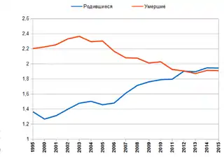 В 2015 году в России родилось 1,944 млн детей, в 2016-м — 1,893 млн, в 2017 году — 1,690 млн[51]. Согласно данным Росстата, в 2017 году возникла естественная убыль населения: родилось 1 689 884 человек, умерло 1 824 340 человек, естественная убыль населения составила 134 456 человек. В 2020 году родилось 1 436 541 человек, умерло 2 138 586 человек, естественная убыль населения составила 702 072 человек.