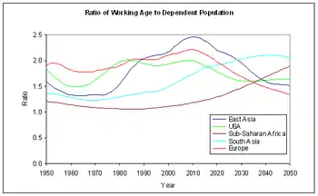 Демографическое окно Европы пришлось на период с 1950 по 2000 год, в России демографическое окно было открыто с середины 1950-х по 2020 год[1][2] и в 2010 году трудоспособное население (15-64 лет) достигло максимума в 72%. В Китае период начался в 1990 году и должен был продлиться до 2015 года. Для Индии период начался в 2010 году и должен продлиться до середины столетия. Большая часть Африки достигнет демографического окна не ранее 2045 года.