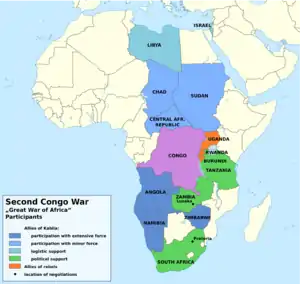 В 1998—2002 гг. страна стала ареной так называемой Великой Африканской войны (Вторая Конголезская война), в которую[15] были втянуты почти все государства Центральной и Южной Африки.