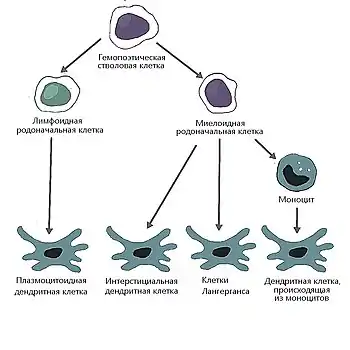 Большинство дендритных клеток принадлежат к миелоидному ряду. Считается, что in vivo дендритные клетки могут образовываться как из гранулоцитарно-моноцитарных предшественников, так и из моноцитов. В культуре миелоидные дендритные клетки можно получить и из клеток костного мозга в присутствии GM-CSF и других цитокинов, а также из моноцитов в присутствии GM-CSF и IL-4. Дендритные клетки лимфоидного ряда дифференцируются из общего лимфоидного предшественника, а также предшественников T- и B-клеток, в частности, тимоцитов на самой ранней стадии их развития в тимусе (DN1-клеток). Предшественников лимфоидных и миелоидных дендритных клеток объединяет экспрессия цитокинового рецептора FLT3, что отличает их от предшественников других иммунных клеток. Таким образом, дендритные клетки могут образовываться из 6—7 клеточных источников[8].