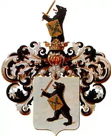 В серебряном щите чёрный медведь с червлёным языком, обращённый вправо, держит в правой лапе золотой меч, в левой — золотой щит в котором накрест положены зелёные дубовая и лавровая ветви.
