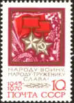 В 1975 году в серии, посвящённой 30-летию Победы, были выпущены марки с тематическими рисунками, а также почтовый блок с изображением Ордена Отечественной войны, Ордена Победы и гвардейской ленты. На большинстве марок приведены лозунги, которые могут служить заголовками тем при построении тематических коллекций[4]: