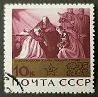 К юбилеям Победы советского народа в Великой Отечественной войне 1941—1945 годов в СССР издавались красочные серии почтовых марок. Так, сюжеты большинства марок с бронзовой плашкой, выпущенных в 1965 году к 20-летию Победы, были основаны на картинах и плакатах[2]: