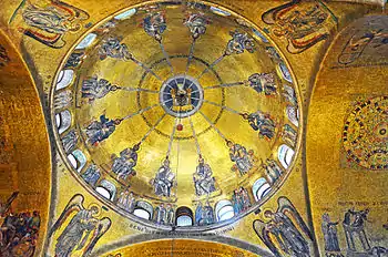 Огненные языки исходят от этимасии с голубем; ниже апостолов между окнами изображены представители разных народов