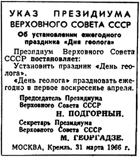 - Указ президиума Верховного Совета СССР об установлении ежегодного праздника «Дня геолога» // Известия. 1966. 31 марта.