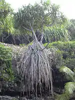| Группа Б. Деревья, обладающие, кроме подземных корней, ещё и специализированными надземными корнями | Подгруппа а. Деревья с «ходульными» надземными корнями в нижней части ствола | Пандан кровельный (Pandanus tectorius) | ![]() | |||