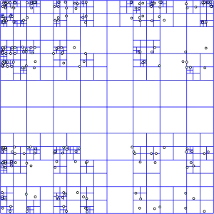 Если дерево используется для представления множества точек (например, широты и долготы положений каких-либо городов), области разбиваются до тех пор, пока листья будут содержать не более одной точки.