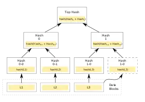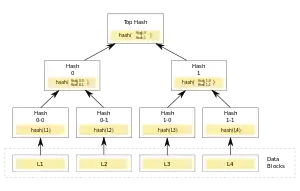 Хеш-деревом, деревом Меркла (англ. Merkle tree) называют полное двоичное дерево, в листовые вершины которого помещены хеши от блоков данных, а внутренние вершины содержат хеши от сложения значений в дочерних вершинах. Корневой узел дерева содержит хеш от всего набора данных, то есть хеш-дерево является однонаправленной хеш-функцией. Дерево Меркла применяется для эффективного хранения транзакций в блокчейне криптовалют (например, в Bitcoin, Ethereum). Оно позволяет получить «отпечаток» всех транзакций в блоке, а также эффективно верифицировать транзакции[1].