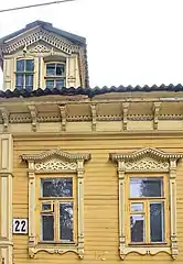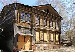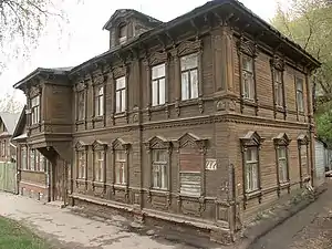 Академическая разновидность эклектики, включавшая все варианты «классицистических стилей» — неогреческий, неоренессанс, необарокко, неорококо и поздний классицизм, развивалась в рамках архитектуры каменных строений[40]. Профессиональная деревянная архитектура Нижнего Новгорода перенимала приёмы каменной архитектуры, как в плане объёмно-пространственной композиции, так и в декоре деревянных домов. Типичным для деревянной академической эклектики был симметричный плоскостной фасад[41].