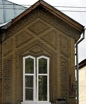 Окраинные районы города, не прерывавшие связей с русской деревней (Печёрская слобода, территория вдоль древней дороги из Балахны в Нижний Новгород у сормовского завода, район Всесвятского кладбища), с конца XVIII — до середины XIX века продолжали застраиваться деревянными домами, обильно украшенными глухой резьбой[38]. В самом Нижнем Новгороде народное направление деревянной архитектуры, развитие которого было прервано периодом господства классицизма с его образцовыми фасадами, снова заявило о себе в середине XIX века, когда стало совершенствоваться и приспосабливаться к городским условиям традиционное крестьянское жилище, находившееся как раз на окраинах города и в окружавших его поселениях. В итоге, двухэтажный городской доходный дом и до некоторой степени одноэтажный индивидуальный, утратив функциональную связь с сельским жилищем, сохранил типичный для последнего декор, несколько видоизменившийся, усовершенствованный[3][26].