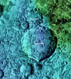 На востоке от кратера находится гористая местность, которая ранее называлась горами Дерфель, однако это наименование отменено Международным астрономическим союзом.