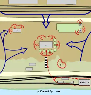 ![]() Схема боя десанта: 1 — контора элеватора (два этажа с подвалом), 2 — каменный сарай северо-западнее, 3 — деревянный домик северо-восточнее конторы, 4 — сарайчик, 5 — окоп на насыпи в 30 метрах юго-восточнее конторы | |||