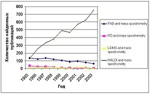 Карас (англ. Karas) и Гилленкамп (англ. Hillenkamp)[6] предложили применять в качестве матрицы молекулы органических веществ небольших размеров, обладающие высокими абсорбционными свойствами при длине волны лазерного излучения. Это легло в основу метода МАЛДИ. Метод МАЛДИ открыл более широкие возможности масс-спектрометрии в исследовании таких биомолекул, как пептиды, белки, олигонуклеотиды, полисахариды и др. Диапазон масс молекул, которые можно изучать этим методом, практически неограничен: известны случаи, когда в спектрах наблюдали ионы с массами более чем 1000 кДа.