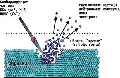 Кинетическая энергия бомбардирующего атома или иона рассеивается при столкновении с молекулами жидкой мишени. Материал, удаляемый с бомбардируемой поверхности, состоит главным образом из молекул и кластеров, причем часть из них возбуждена и ионизована. В области вблизи поверхности существует заметное локальное давление. Эту область принято называть «кромкой» (selvedge region). В ней возможны такие процессы, как химическая ионизация (ион-молекулярное взаимодействие между заряженными и нейтральными частицами) и столкновительная стабилизация возбужденных молекулярных ионов.