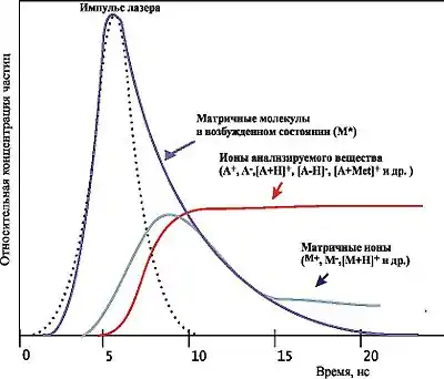 На начальном этапе образования факела его плотность близка по величине плотности вещества в конденсированном состоянии. C расширением факела (в первые наносекунды) происходит распад конгломератов вплоть до образования отдельных молекул или их фрагментов, а также заряженных (преимущественно матричных) частиц. Ионизацию молекул, происходящую непосредственно при выбросе материала из конденсированного состояния, принято рассматривать как первичную. Разница во времени с начала момента импульса лазера до появления матричных ионов составляет примерно несколько нс.