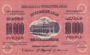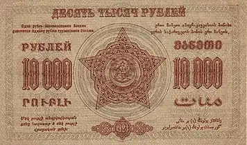 Банкноты номиналом в 10 000 рублей были выпущены в ЗСФСР в 1923 году.