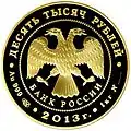 100[2] | В центре диска — эмблема Банка России (двуглавый орел с опущенными крыльями, под ним — надпись полукругом «БАНК РОССИИ»), обрамленная кругом из точек и надписями по кругу — вверху: «ДЕСЯТЬ ТЫСЯЧ РУБЛЕЙ», внизу: слева — обозначения драгоценного металла, пробы сплава и товарный знак монетного двора, в центре — год выпуска, справа — содержание химически чистого металла и порядковый номер монеты № ____. | Монеты данного вида выпускаются в рамках памятных программ Банка России с различными рисунками реверсов. | с 2000 по 2015 |