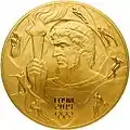 100 | В центре диска — рельефное изображение Государственного герба Российской Федерации, над ним вдоль канта — надпись полукругом: «РОССИЙСКАЯ ФЕДЕРАЦИЯ», внизу под гербом в две строки: слева — обозначения металла по Периодической системе элементов Д. И. Менделеева, пробы сплава и порядковый номер монеты № ____, справа — обозначение содержания химически чистого металла и товарный знак монетного двора, внизу в центре в две строки — номинал монеты: «10000 РУБЛЕЙ» и год проведения Олимпиады: «2014 г.». | Выпущено 2 монеты с аверсом данного вида (с различными рисунками реверсов) в рамках программы Банка России, посвящённой Олимпиаде 2014 года. | 2013 |