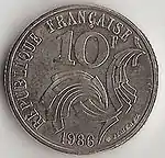 Она заменила монету десять франков Матье, которую часто подделывали. Однако, из-за сходства монеты по размеру и цвету с монетой 1/2 франка, она пользовалась недовольством значительной части населения и была изъята из обращения в 1987 году.