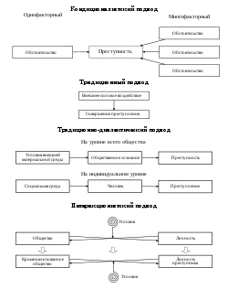 - Традиционно-диалектический подход. В нём выделяются условия внешней материальной среды, воздействующее как на общественное сознание в целом, так и на конкретного человека, и непосредственные или ближайшие причины преступления, которые связываются с характеристиками конкретной личности. В рамках данного подхода воздействие условий на причины и причин на поведение является однонаправленным: условия, преломляясь в сознании человека формируют причины, которые определяют совершение конкретного поступка.