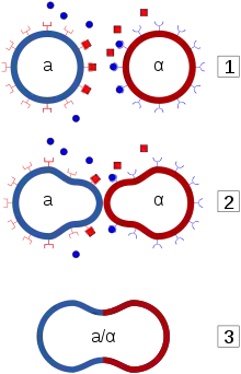 a-клетки выделяют a-фактор, феромон, сигнализирующий о присутствии a-клетки соседним α-клеткам. a-клетки, в свою очередь, реагируют на α-фактор, феромон α-клеток, разрастаясь в направлении источника α-фактора. Аналогичным образом ведут себя α-клетки. Это обеспечивает спаривание только гаплоидных клеток разных типов спаривания и делает невозможным спаривание клеток одного полового типа[6][2].