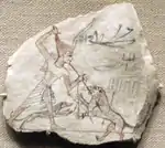 На остраконе периода Рамессидов, фараон изображён в красной короне.