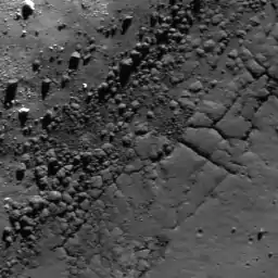 На приведенном выше снимке показана часть дна чаши кратера де Форест к востоку от центрального пика. Большую часть площади снимка занимают обломки некоторые из которых достигают размера 15 м. При образовании кратера часть выброшенных пород образовала расплав, который после застывания образовал твердое скальное покрытие на внутреннем склоне кратера и центральном пике. Остатки такого покрытия видно на снимке в виде ровной поверхности с трещинами. С течением времени под действием близких лунотрясений это хрупкое покрытие разрушалось образуя видимые на снимке обломки[4].