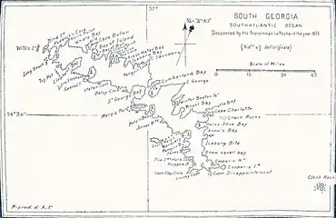 Окружающая обледенелая, гористая местность была описана так: «видны снежные горы от самого берега, очень скверная погода». Как только погода прояснилась, команда подняла парус, и, огибая юго-восточную оконечность Южной Георгии, заметила с корабля скалистые острова Клерк Рокс далее на юго-востоке.