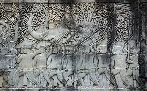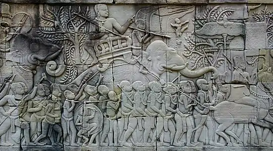 Утвердившись у власти и наладив мирные отношения с Китаем и Дайвьетом, Джайя Индраварман IV объявил своё правление «первым царствованием ради блага мира», однако действительной его целью была подготовка мощного военного удара по Кхмерской империи[8], чтобы отомстить за разрушительное вторжение кхмерского чакравартина Сурьявармана II. Первые военные набеги на территорию кхмеров Джайя Индравармана совершил уже в 1167 году. В 1170 году он неудачно вторгся в пределы Кхмерской империи, а в 1177 году направил большую флотилию в дельту реки Меконг, намереваясь захватить кхмерские силы врасплох. При помощи опытного китайского лоцмана тямский флот поднялся вверх по Меконгу до его притока Тонлесап, вверх по которому затем добрался до Великого озера (Тонлесап). Пройдя всё озеро с юго-востока на северо-запад, флот Джайя Индравармана вошёл в реку Сиемреап и неожиданно ударил по кхмерской столице Яшодхарапуре. Будучи слабо укреплена (город был обнесён лишь деревянным частоколом) и не имея достаточного гарнизона, столица Кхмерской империи была взята тямским флотом. Город был дочиста разграблен, ангкорские храмы осквернены, жители обращены в рабство, а кхмерский чакравартин Трибхуванадитьяварман — захвачен и казнён по приказу Джайя Индравармана IV. Флотилия вернулась в Тямпу, нагруженная несметной добычей[5][9][10][11].