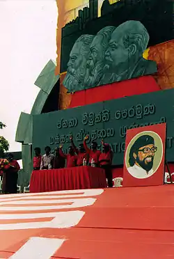 JVP была основана в 1965 году с целью стать ведущей силой коммунистической революции в Шри-Ланке[9]. В то время на Цейлоне существовало еще четыре левые политические партии: троцкистская Ланка Сама Самаджа Парти (ЛССП), созданная в 1935 году[10]; Коммунистическая партия Шри-Ланки, которая отделилась от ЛССП в 1943 году из-за разногласий по поддержке Великобритании во время Второй мировой войны[11] ; основанная более умеренными бывшими членами ЛССП Махаджана Эксат Перамуна; компартия маоистского толка.