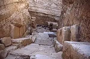 Более или менее удовлетворительно сохранилась лишь её подземная часть, доступная до погребальной камеры; дело в том, что строилась она методом «открытой ямы» и после разрушения поверхностной части так и осталась открытой. Длина входного коридора — около 50 метров. Стены ведущих вниз коридоров, также как и стены погребальной камеры, были выложены большими блоками известняка и гранита толщиной около двух метров.