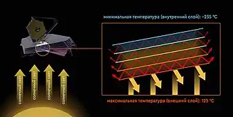 Теплозащитный экран космического телескопа «Джеймс Уэбб» состоит из 5 слоёв каптона, на каждый из которых нанесено покрытие из алюминия, и имеет размер 21,1 на 14,6 метров. Экран нужен для защиты основного зеркала и научных приборов обсерватории от потоков тепла и космического излучения. Первые два «горячих» слоя обладают покрытием из легированного кремния. Моделирование показывает, что максимальная температура первого слоя будет составлять 383 кельвин, а минимальная температура последнего слоя составит 36 кельвин. Механизм развёртывания экрана имеет 90 натяжных тросов, а также установка 107 спусковых устройств, которые будут удерживать слои каптона в правильном положении до момента развёртывания[74].