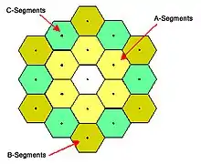 - Использование шестиугольных сегментов из которых можно собирать зеркала различной площади, сегментная форма также позволяла сворачивать телескоп в компактную форму в ракете-носителе